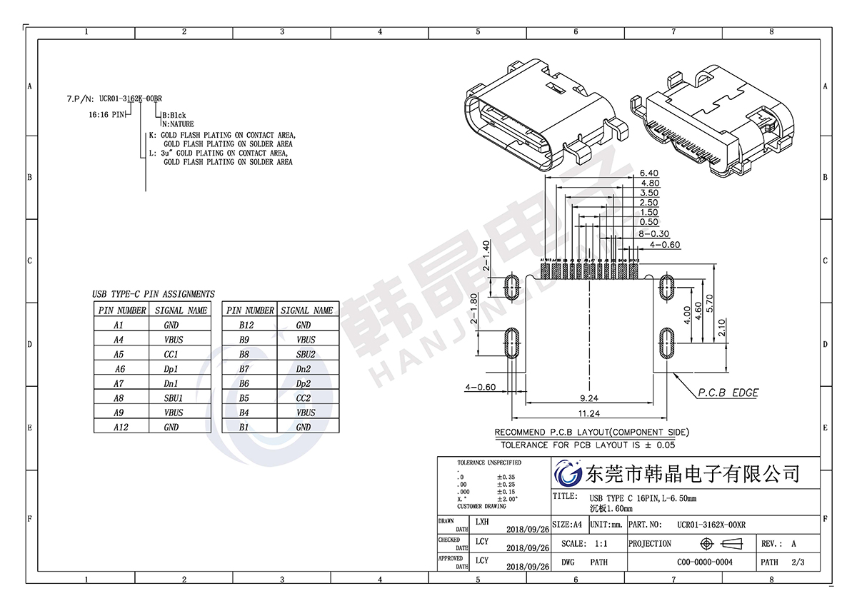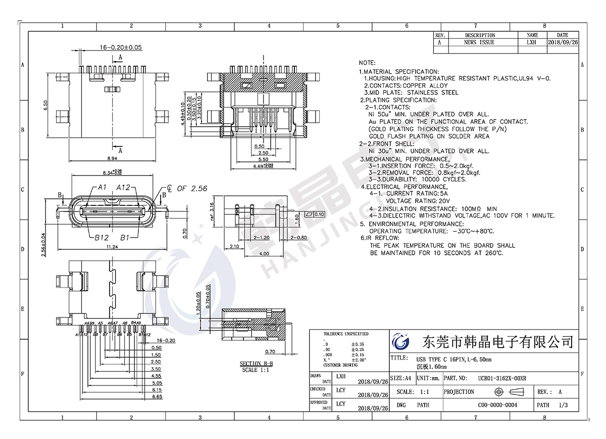 絕緣體材料: LCP,UL94V-0;COL0R;BLACK