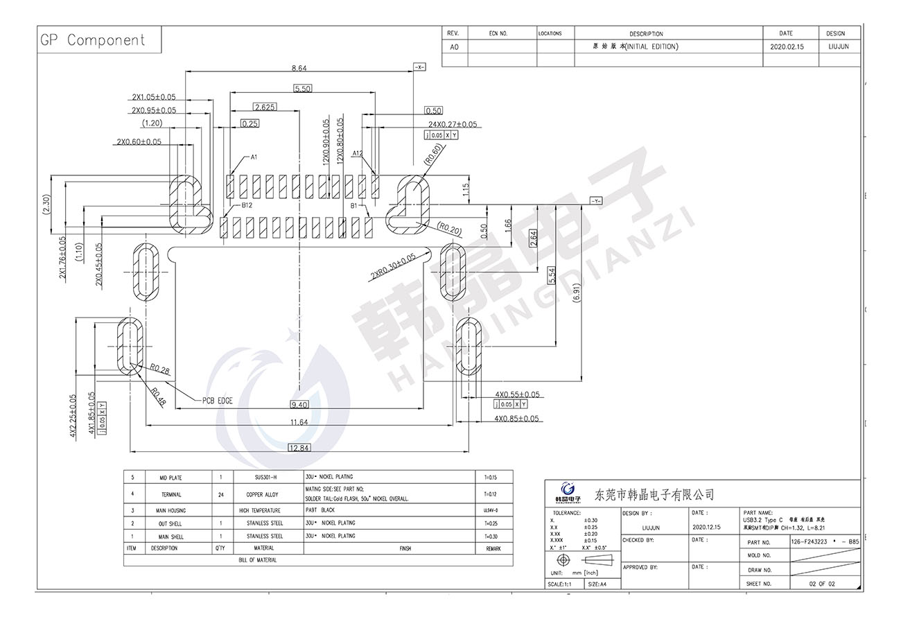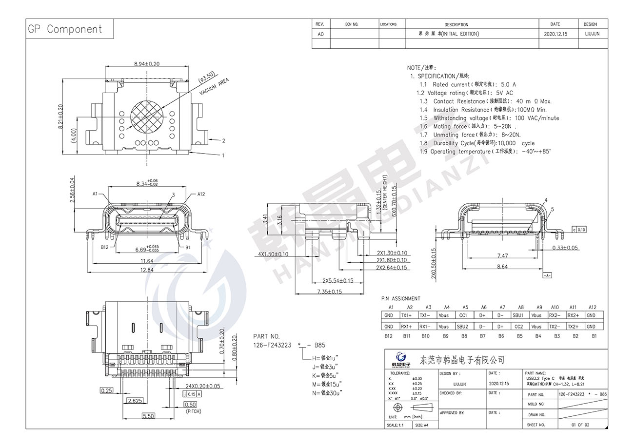 • B85USB3.2Type C 母座 有后蓋 雙殼 雙貼SMT有DIP腳 CH=1.32 L=8.21 型號(hào):126-F243223X-B85