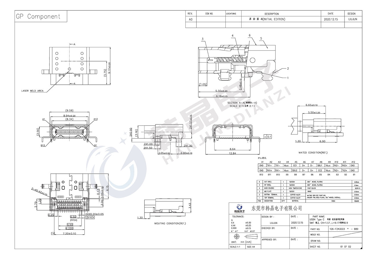 • B89USB4 Type C 母座 有后蓋 雙殼 雙貼SMT 板上CH=1.57,L=9.17殼腳長(zhǎng)0.9 型號(hào):126-F243223X-B89