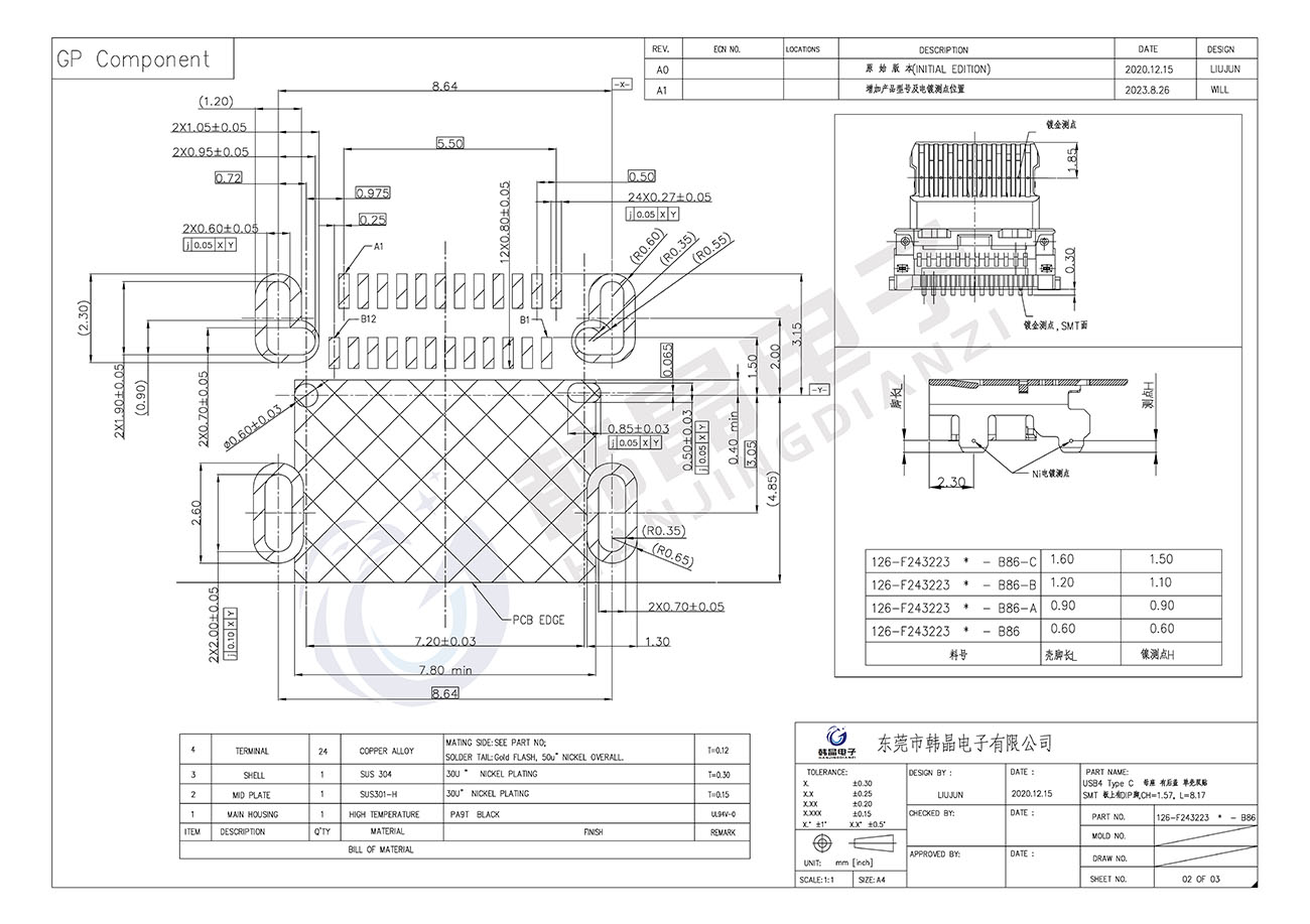 • B86(ABC )USB4 Type C 母座 有后蓋 單殼 雙貼SMT 板上有DIP腳,CH=1.57 L=8.17 型號(hào):126-F243223x-B86