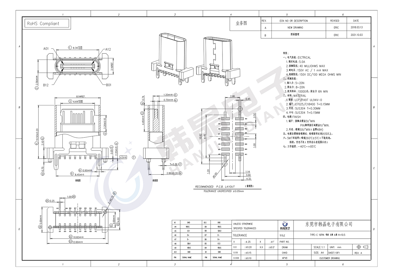 絕緣體材料: LCP, PA9T UL94 v-0