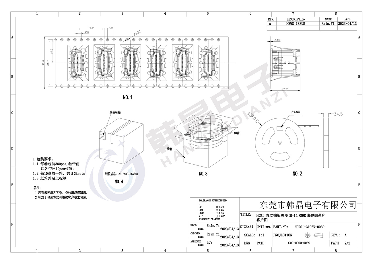 • HDMI立貼連接器 15.0H側(cè)彈片 型號:HDR01-3193K-00BR